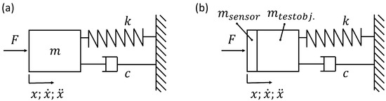 Figure 1. (a) mechanical model of a mass-damper-spring system; (b) mass separated into m s e n s o r and m t e s t o b j . .