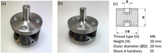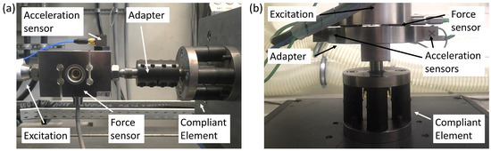 The use of the dynamic calibration is demonstrated for two compliant elements on two test rigs shown in Figure 4. In order to minimize measuring any disturbance, non-adjustable compliant elements are used instead of an AIE. This prevents disturbances of the adjustment mechanism and as well as an inaccurate setting of the AIE. The used compliant elements consist of two lathed steel parts with four M6 screw threads on one side and a clamping surface with a diameter of 14 mm on the other side. One configuration of the compliant elements has a set of buffers (rubber/metal buffer Typ-C 20 × 20-M6, Wuerth GmbH and Co. KG, Künzelsau-Gaisbach, Germany) aligned in parallel with each of the screws, each set consisting of two buffers stacked on top of each other (compliant element A in Figure 4a, and weighs 0.7123 kg. The second configuration has only one buffer aligned in parallel with each of the screws resulting in four buffers (compliant element B in Figure 4b), and weighs 0.6401 kg.