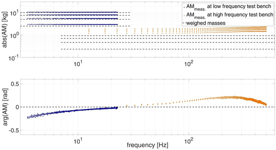 To determine the calibration values, the masses are attached to the load cell of the test bench. The masses can vibrate freely and therefore AM should be a real constant value over the whole frequency range which corresponds to the mass. Figure 5 shows the ideal values of the measured masses with dashed lines. The masses are given in Section 2.5. The values for A M m e a s . are derived from testing. They are marked blue for the low frequency and orange for the high frequency test bench. For each mass configuration studied, three repetitions were performed. The mass configuration and reputations were performed in a random order. Each test is evaluated at 200 different frequencies. All results are plotted in Figure 5.