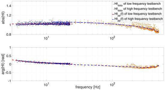 The determination of the measurement systems FRF  H I p p is given by Equation (18). The masses of the sensor at each test bench are derived at Section 2.5. Each weighted real constant mass configuration (Table 1) is divided by the corresponding measured complex value of A M m e a s . ( f ) . The resulting values for the low and high frequency test bench are marked in frequency domain as data points (Figure 6). At each evaluated frequency, 12 data points resulting from four different mass configurations with each three reputations are shown.