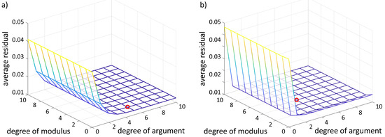 The average residual e can be calculated by Equation (19) for each function H I p p , f i t . Figure 7 shows the average residual over the degree of the polynomial of the argument and the modulus. The average residual is calculated from the summed up difference between each data point and the function, with a given polynomial degree divided by the amount of data points k.