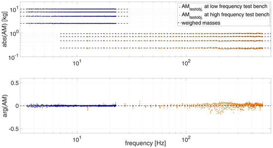 To check the calibrated measurement by mass cancellation and the determined function, H I p p ( f ) is reapplied to the already measured masses under vibration. A M t e s t o b j . ( f ) is calculated by Equation (13), the results are shown in Figure 8. As in Figure 5 the ideal values of the measured masses (Section 2.5) are shown with dashed lines and the data points of each test bench are marked blue and orange.