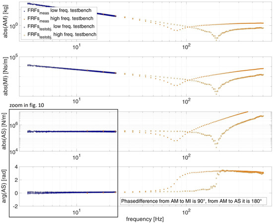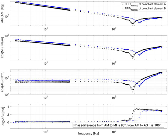 The evaluation of the possibilities of the adapted approach (Section 2.2 and Section 2.3) is shown in this section for the compliant elements A and B (Figure 4). The measured force, analytically given by Equation (1) results from the stiffness, damping, and mass properties of the element. The resulting force is dependent on displacement, velocity and acceleration, which are derivatives of each other. Since AM, MI and AS are given by force over acceleration, velocity and displacement (see Equation (3)), they are inverse derivatives as well (see Equation (5)). Figure 9 shows the test results of the compliant element A (Figure 4) in form of AM, MI and AS, as well as the phase of AS. All plots have their advantage in analyzing specific parts of the test objects behavior. The measured data points for A M m e a s . , M I m e a s . and A S m e a s . are marked as dots and the calibrated ones A M t e s t o b j . , A M t e s t o b j . and A S t e s t o b j . are marked as asterisks.