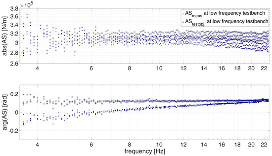 Figure 10 shows AS of the low frequency test bench in detail. As previously mentioned, in the low frequency range the influence of mass is negligible. The correction by H I p p ( f ) on a r g ( A S ) is small; however, H I p p ( f ) has a decisive influence on the phase angle a r g ( A S ) . The uncorrected phase a r g ( A S m e a s . ) changes from negative values to positive values with increasing frequency. The dynamic calibrated phase a r g ( A S t e s t o b j . ) stays nearly constant over frequency at around 0.1 rad.