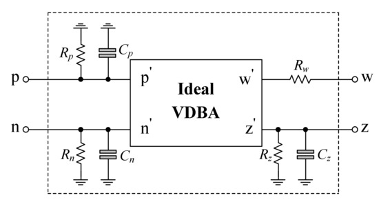 In this section, the effect of various parasitic impedances of the employed VDBA on the performance of the proposed mixed-mode universal filter in Figure 3 is to be analyzed. In practice, the non-ideal VDBA model with its various terminal parasitics is represented in Figure 4. It appears that the finite parasitic resistances and capacitances at the p, n, and z terminals are in the form [Rp//(1/sCp)], [Rn//(1/sCn)], and [Rz//(1/sCz)], respectively, while the low-value serial resistance (Rw) appears at the w terminal. Ideally, these parasitic values are assumed to be Rp = Rn = Rz = ∞, Rw = 0, and Cp = Cn = Cz = 0. Under the effect of these parasitics, the non-ideal denominator of all transfer functions in all four working modes becomes: