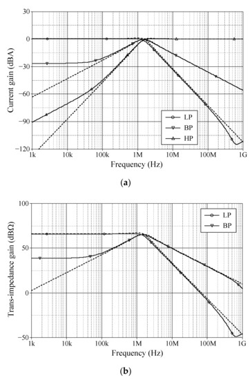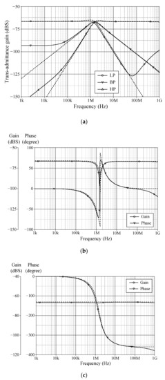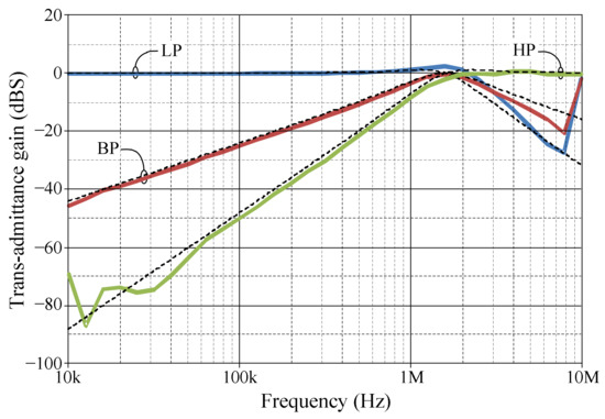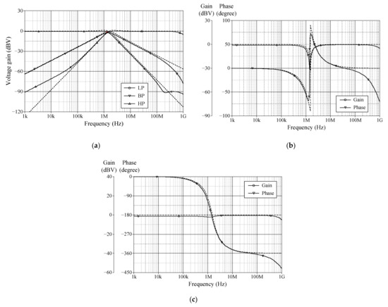 - For TAM operation: With vin = v3 and v1 = v2 = v4 = 0, then we obtain the TAM filter functions as follows:andEquations (12)–(16) represent the TAM filter functions of the LP, BP, HP, BS, and AP responses with controllable passband gains, respectively. Gain constants can be defined as H1 = 1/R1 and H2 = gm2. It should also be noted from Equations (15) and (16) that a simple component matching condition (R1 = 1/gm2) is required in the case of BS and AP filter realizations.