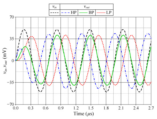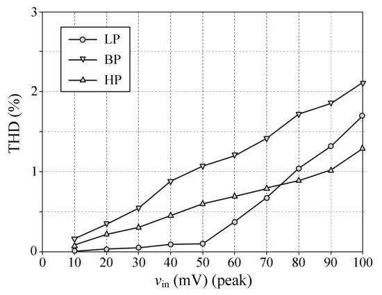 To examine the transient behavior of the proposed filter, the LP, BP, and HP responses were carried out for the VM operation. The sinusoidal input voltage of 50 mV (peak) at a frequency of 1.52 MHz was applied and the corresponding output current waveforms are given in Figure 8. As can be monitored, the phase differences between the input and LP, BP, and HP outputs are found to be −92.73°, 5.45°, and 87.29°, which are consistent with ideal values equal to −90° 0°, and 90°, respectively. The percentages of the total harmonic distortion (THD) for the three filter outputs are 0.22% for LP, 1.12% for BP, and 0.64% for HP. In addition, the THD variations of the LP, BP, and HP output voltages on the input signal amplitudes are also shown in Figure 9. It is shown that when the applied input signal amplitude increases by 100 mV (peak), the THD values are within 2.2%. Through the simulation results, the circuit has a total power consumption of 0.373 mW.