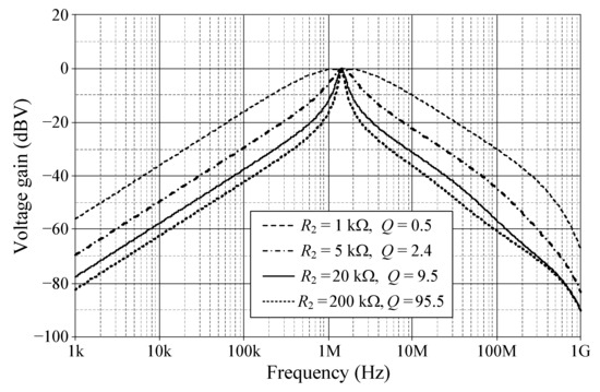 As indicated in Equations (19) and (20), the parameters ωo and Q of the proposed filter can be set orthogonally. Figure 10 shows the Q-factor adjustability of the BP responses in VM for various values of R2. In this case, the Q-factors are set as 0.5, 2.4, 9.5, and 95.5 with the R2 value of 1 kΩ, 5 kΩ, 20 kΩ, and 200 kΩ, respectively. The results demonstrate that the high-Q tuning can be achieved by adjusting R2 without influencing fo. Figure 11 represents the VM gain responses of the BP filter for three different values of IB and R2. The BP filter is designed for fo = 1.12 MHz, 2.15 MHz, and 3.72 MHz, while keeping Q fixed at 9.5. Table 4 gives the component values used in Figure 11 and the corresponding calculated and simulated fo.
