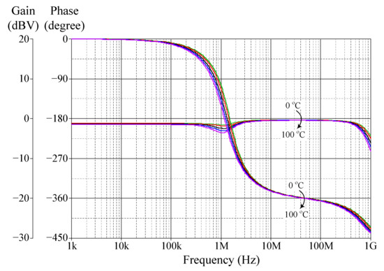 To study the effect of temperature variations, the proposed filter was analyzed under various ambient temperatures. Figure 12 demonstrates the simulated frequency responses of the AP filter in VM for different temperatures (0 °C, 20 °C, 50 °C, 75 °C, and 100 °C). At the natural angular frequency fo = 1.52 MHz, the simulation results show that the gain and phase responses lie within the range of –1.3 dBV to –2.7 dBV, and –184° to –228°, respectively. This variation does not have a strong effect on the gain and phase responses of the circuit. The noise behavior of the proposed filter versus the frequency has also been evaluated, as shown in Figure 13. The output voltage noises of the BP filter at the frequency of 1.52 MHz were found to be 20.50 nV/Hz1/2 for VM and TIM operations, while the output current noises for CM and TAM were 8.45 pA/Hz1/2.