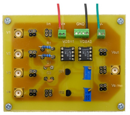 - Linear Technology, LT1228: 100 MHz Current Feedback Amplifier with DC Gain Control. Available online: https://www.analog.com/media/en/technical-documentation/data-sheets/1228fd.pdf (accessed on 9 September 2021).