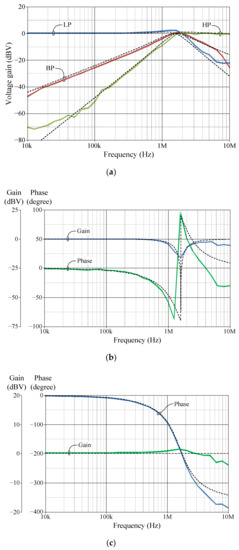 Ideal (dashed line) and measured (solid line) frequency responses for VM: (a) LP, BP and HP; (b) BS; (c) AP.