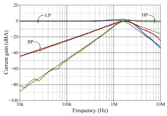 - Lee, C.-N. Mixed-Mode Universal Biquadratic Filter with No Need of Matching Conditions. J. Circuits Syst. Comput. 2016, 25, 1650106. [Google Scholar] [CrossRef]