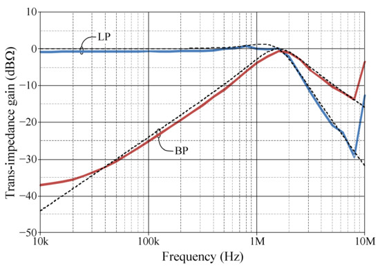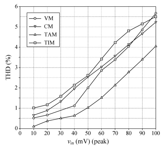 Furthermore, the ideal and experimental results of the frequency-domain responses obtained from the VM, CM, TAM, and TIM filters are given in Figure 20, Figure 21, Figure 22 and Figure 23, respectively. The results of Figure 20, Figure 21, Figure 22 and Figure 23 show that a good agreement between experimental measurements and theoretical predictions can be observed, as desired. Additionally, the experimental THD variations of the BP output in all modes of operation are plotted for various input signal amplitudes at f = 1.59 MHz, as given in Figure 24.