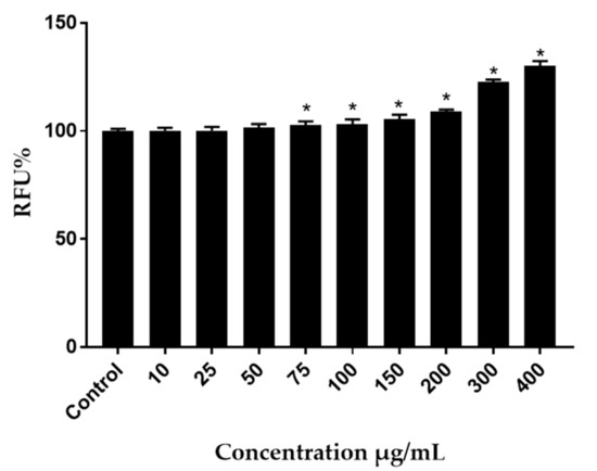 Effects of the Cetraria islandica extract on normal human foreskin fibroblasts cells’ viability after 24 h exposure. The results are presented as relative mean values ± standard deviations, where the negative control (Control) is 100%. Significant differences in comparison with the negative control (ANOVA + Dunn’s; p < 0.05) are marked with *. RFU, relative florescence units.