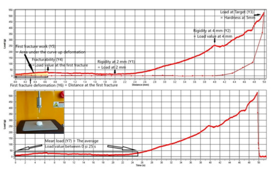 Mechanical properties of freeze-dried products significantly impact their behavior during processing, packaging, transport, and use [24]. Texture analysis was chosen for mechanical characterization as a sensitive method that provides accurate results even for porous fragile structures [23]. During sample testing, the equipment records load vs. distance profiles out of which certain parameters can be determined (Figure 2).
