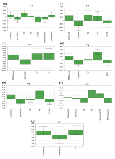 The influences of formulation factors (X1, X2, X3) on the mechanical characteristics of freeze-dried products: (a), rigidity at 2 mm (Y1); (b), rigidity at 4 mm (Y2), (c), load at target (Y3), (d), fracturability (Y4), (e), 1st fracture work (Y5), (f), 1st fracture deformation (Y6), (g), mean load (Y7).