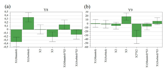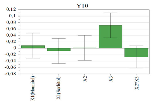 For the viscosity of the reconstituted samples (Y10) the range of variation was not very wide. The MC ratio (X3), the viscosity modifying agent, was the only factor with a significant influence on the viscosity values (Y10) (Figure 6). The higher the MC ratio, the higher the viscosity. The lowest values (6.31–8.28 cP) corresponded to the first four formulations with no MC added (F1–F4).