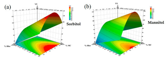 The weight loss percentage was calculated to evaluate the consequences of fragile structures on the manipulation and extraction from the blister pockets. It was meant to check if the entire product could be easily removed or a part of it remains stuck into the alveolae. The weight loss percentage (Y8) was strongly correlated to the mechanical profiles: the highest value was obtained for F2 and F4, formulations with small mechanical resistance, highly fragile samples, not appropriate for packaging and transporting. This behavior is upheld by the small fracturability values of the same formulas. In addition, the weight loss percentages for F7 and F10 were the lowest, in agreement with the fracturability values, which were the highest for these two samples. The filler type (X1) had considerable influence on Y8: the presence of sorbitol determined the embrittlement of the structures and loss of the integrity of the sample (Figure 4a). On the contrary, mannitol had a beneficial impact in maintaining the integrity of the matrices. As expected, the presence of MC in the formulations had a negative effect on the weight loss percentage (Y8), which could be due to the adhesive properties of hydrophilic polymers can contribute to preserving the porous structure and avoid material loss when manipulated.