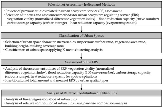 This study was conducted with the following procedure: (1) selection of indices and assessment methods for urban ERS assessment; (2) urban space classification; (3) assessment of ERS by type of urban space; and (4) holistic and classificational contribution analysis of the regulating services (Figure 1).