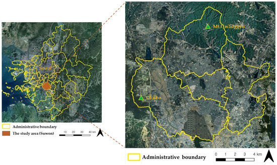 The study area (Suwon City, Korea) (https://map.kakao.com/, accessed on 1 June 2021).