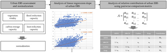 Matrix A was then constructed by deriving slopes through linear regression slope analysis between ERS. In this study, a 4 × 4 matrix is formed because four regulating services have been selected. Next, the relative contribution was calculated by calculating the eigenvectors of the ERS elements based on the set matrix. In addition, the reliability of the analysis result was verified by checking the CI (Consistency Index) and CR (Consistency Ratio) values to diagnose the consistency of the calculated contribution.