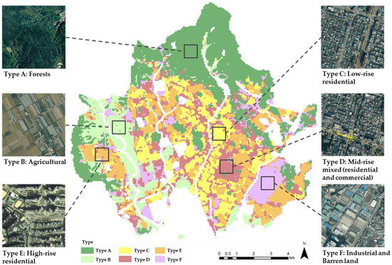 Repeated K-cluster analysis confirmed that the number of samples (when the urban space of the study area was classified into six types) was distributed in a balanced manner. The study areas were forests (type A), agricultural land (type B), low-rise residential areas (type C), mid-rise mixed (residential and commercial) areas (type D), high-rise residential areas (type E), and industrial and barren land (type F) (Figure 4). The spatial characteristics of each type is shown in Table 2. The number of type A grids is 1.5 to 2.5 times larger than that of other types, with a total of 8378, and they are mainly forests on the periphery of the study area or parks and green spaces located sporadically inside the study area. Type B is located between type A and urbanized types C–F, and is mainly used for agricultural purposes. Among the six types, type C has the smallest vegetation area and the highest impermeability. In the case of type C, the building occupancy rate in the grid is 32.28%, which is very high compared to other types, and it is expected to provide the fewest ERS.