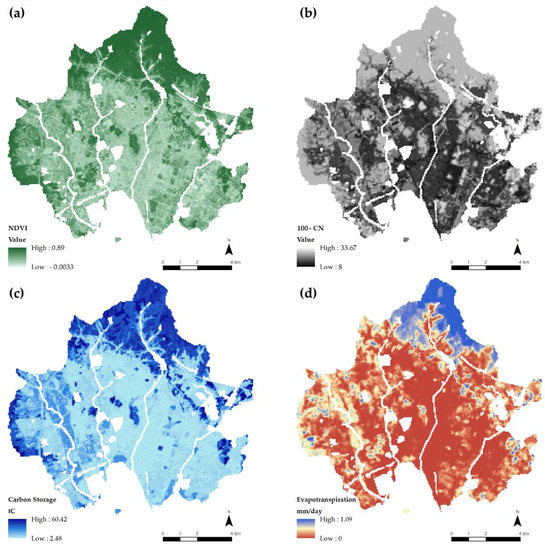 ERS maps (a) vegetation vitality: NDVI; (b) flood reduction capacity: 100-CN; (c) carbon storage capacity: carbon storage capacity; (d) heat reduction capacity: evapotranspiration.