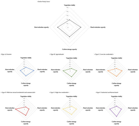 The results of linear regression slope analysis of each type are presented in Appendix A. The calculation results of the relative contributions obtained using the eigenvectors of the urban ERS for each type are the same as those shown in Table 5 and Figure 6. Both the CI and CR values, which are indices of the consistency of the eigenvectors, showed a significance level within 0.1, and the contribution analysis results were analyzed with the assumption that pairwise comparison was valid. The contribution of the ERS in the study area was in the order of heat reduction capacity (0.2964), flood reduction capacity (0.2815), carbon storage capacity (0.2374), and vegetation vitality (0.1847). It was confirmed that such contributions differ, depending on the type of urban space. Type A had the highest contribution in flood reduction, types B–E had the highest contribution in heat reduction, while type F had the highest contribution in carbon storage. In addition, all six types were similar in that they had the lowest contribution in vegetation vitality.