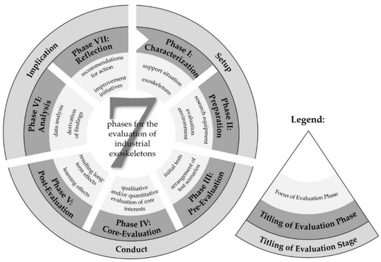 The number and complexity of both application scenarios and heterogeneous industrial exoskeletons require a generic methodology for their holistic evaluation. In order to address the different interests and aims of protagonists, the evaluation must be capable of considering a wide range of aspects and cannot be limited to a few selected criteria or tasks [8]. For this purpose, the seven-phase model in Figure 1 proposes the three stages (1) setup, (2) conduct, and (3) implication, with seven subordinate phases for evaluation intentions.