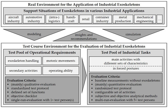 In order to evaluate exoskeletons with intended industrial use in a test course, modeling and simulation of functions and real-life tasks are required. In analogy to different settings and activity profiles in industrial sectors (e.g., the aircraft and automotive industry, mechanical engineering, handicraft, or (intra-)logistics), the tasks of the test course need to match and represent the respective characteristics on an aggregate level. Since evaluation aspects and test scenarios depend on each protagonist’s perspective and interests, each protagonist should critically analyze the support situation where an exoskeleton is intended to be used concerning its specifications first. This step is essential for a targeted examination of operational requirements, representative industrial tasks, and types of analysis in the test course.