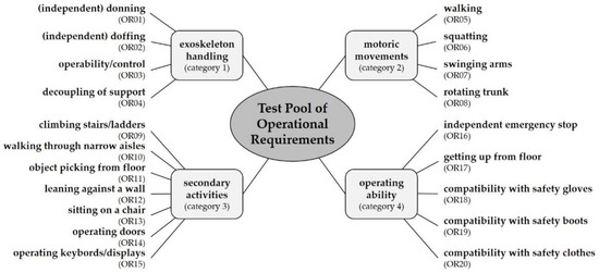 Regarding the operational requirements, four different categories with varying focuses and aims are identified to qualitatively evaluate the general usability of the exoskeleton(s) in the first step. The four categories are (1) exoskeleton handling, (2) motoric movements, (3) secondary activities, and (4) operating ability. In order to analyze relevant aspects, these categories are broken down into twenty specific requirements. Nevertheless, the pool does not replace any (mandatory or legally binding) tests, certifications, or risk analyses at workplaces for system manufacturers and employers. It should merely provide operational testing scenarios for system users with regard to the focused application purpose. For clear coding, the identification tag OR (Operational Requirement) with ascending numbers is used. The test course comprises the following pool of operational requirements: