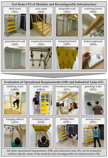 Figure 4 provides an overview of the addressed test items of the modular and reconfigurable infrastructure as well as exemplary practical applications with regard to the evaluation of operational requirements and industrial tasks.