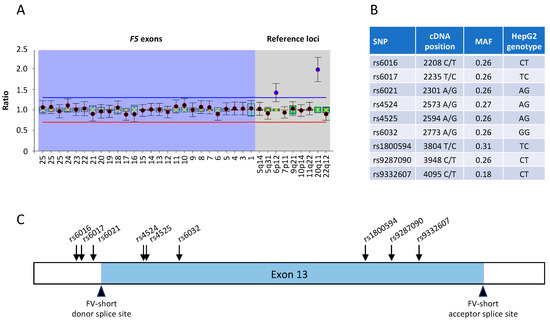 Characterisation of the F5 gene in HepG2 cells. (A) MLPA analysis of the F5 gene in HepG2 cells. The normalised copy number is plotted for individual F5 exons (purple background) and for reference genes located on different chromosomes (grey background). A ratio of ~1 indicates a normal copy number (n = 2), whereas ratios above the blue line or below the red line indicate copy numbers >2 or <2, respectively. (B) Common SNPs identified in F5 exon 13 in the genomic DNA of HepG2 cells; MAF: minor allele frequency. (C) Positions of the identified F5 exon 13 SNPs relative to the FV-short-specific donor and acceptor splice sites.