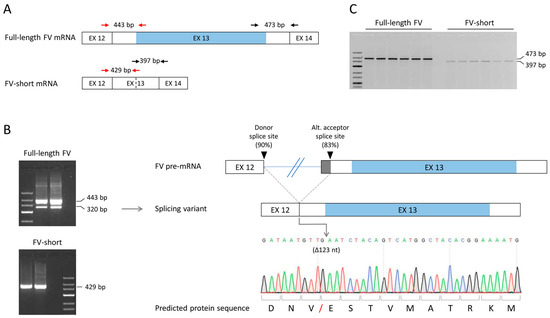 To avoid co-amplification of this additional F5 splicing variant, we switched to a new PCR design based on transcript-specific forward primers in exon 13 and a common reverse primer in exon 14 (black primers in Figure 3A). This revised PCR set-up yielded unique and specific products for both the full-length FV and the FV-short transcript (Figure 3C) and was adopted in all subsequent qualitative and quantitative analyses.