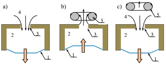 Generation of synthetic jet (SJ): (a) injection of fluid; (b) expulsion of fluid and SJ formation; (c) moving away of SJ and injection of a new volume of fluid to cavity (1—deformable diaphragm; 2—cavity; 3—orifice; 4—fluid injected to cavity; 5—synthetic jet).