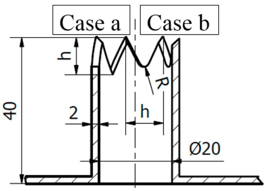 In the paper, SJA with nine different orifices were investigated. The first orifice was referenced and the orifice diameter was 20 mm and length 40 mm. The remaining was made based on the referenced orifice and differed in the number of chevrons. The chevrons were isosceles triangles with the same base and height length. In case “a”, the orifices were classic chevron orifice and in case “b” the top of cutouts was rounded with a radius equal to R = 1/6 h—both types of the orifices were presented in Figure 2. The actuator with reference orifice was tagged as a case 0, and the next orifices were marked with consecutive numbers. The dimensions of the orifices were presented in Table 1. The orifices were printed in 3D technology from PETG (polyethylene terephthalate glycol-modified).