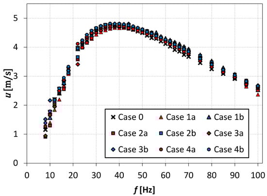 The first step of measurements was the finding of the natural frequency of the actuator. For this purpose, the SJ velocity as a function of frequency was presented in Figure 4. The natural frequency in cases 0, 3, and 4 was Hz, and in cases 1 and 2 was Hz. The frequencies were the same as in [29] for cases 0 and 1a.