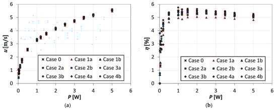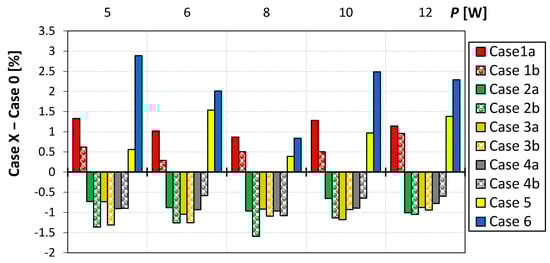 Figure 5 presents the SJ velocity and the efficiency of the actuators as a function of the electric power. The presented graphs had a classic form which can be observed in many papers [47,48]. However, the differences between cases are slight especially at the power above 1 W. For that reason, the differences between the actuator efficiency in case 0 and other cases were presented in Figure 6. The velocity and the efficiency are in the same way dependent on the time-mean reaction force (see Equations (1) and (4)), but the efficiency includes additionally the electrical power. Therefore, the dependencies presented in Figure 6 are similar in the case of velocity.