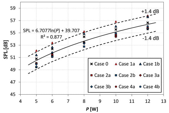 The SPL differences presented in Figure 8 are small, and most of them are smaller than the measurement uncertainty (see Table 2). However, their distribution is not random, and the SPL generated by SJA with the chevron orifice is smaller than the SPL generated by SJA with the circular orifice at all cases, except cases 1a, 1b, 5, and 6. Additionally, in cases 1, 2, and 3, the smaller SPL was obtained at rounded cutouts than at classic, sharp. The SPL generated in case 4a was smaller than in case 4b only at power .