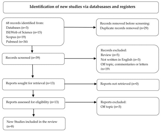 Systematic Reviews and Meta-Analyses (PRISMA) flow chart representing the process for inclusion of papers. For this study, nine articles were assessed for eligibility after screening: among these, 8 new studies were included in the analysis [].