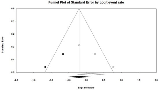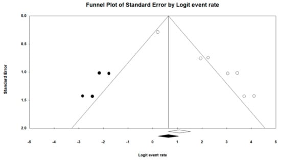 The overall healing rate resulted 91.9%, ranging from 74.9 to 97.8%. Due to the significantly high amount of heterogeneity among studies (I2 = 80.0%; Q = 30.04), a mixed-effect model was implemented. With the meta-regression analysis, it was found that the age of the recruited populations tended to become older through the years in a significant way (coefficient = 0.2724 (SE = 0.1180), p = 0.0209) (Table 4). The lowest ES was reported in the study by Tillo et al. (1990) [], who recruited the highest number of diabetes type 1 patients (coefficient = 0.0522 (SE = 0.0102), p = 0.0000) and performed a variety of surgical procedures (Q = 27.24, p = 0.0000). However, these moderators resulted not significant with the multivariate meta-regression analysis. Evidence of publication bias could be detected with visual inspection of the funnel plot (Figure 2) and with the trim-and-fill analysis, resulting in an “adjusted” ES of 70.9%, ranging from 41.0 to 89.5% (four studies were trimmed/removed).