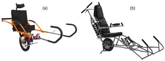 Examples of commercially available trekking wheelchairs: (a) Joëlette© and (b) TrailRider©, [16,17].