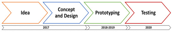 As introduced before, the main objectives of the Gölem project are the design, build, and testing of a new concept of trekking wheelchair that allows the mobility of disabled people on mountain trails or rough terrains that are not accessible by standard commercial self-propelled wheelchairs. The Gölem project started in 2017 and is still ongoing. The development of this project is divided into four macro-phases, as illustrated in Figure 2: idea, concept and design, prototyping and testing. The first two phases of the project—idea and concept design—have been completed and described in publication [11]. For the sake of clarity, they will only be summarized in Section 2.1 and Section 2.2.