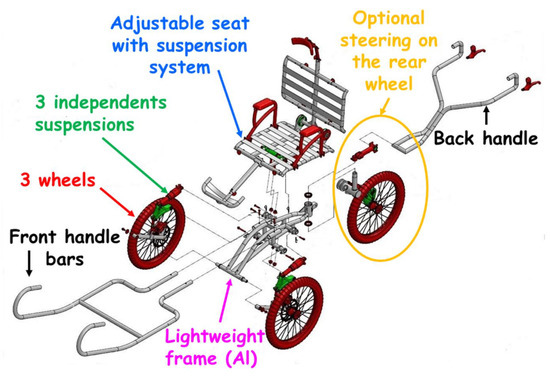 The second phase of the project involved the study and definition of the new concept with more emphasis on the definition of its new layout, materials, and its new suspension system. The results of this phase were the detailed drawings and 3D CAD modeling of the device and of its components. Figure 3 shows the main features of the new trekking wheelchair consisting of three wheels with independent suspensions, an adjustable and cushioned seat, a front handlebar, a back handle (with optional steering), and the aluminum frame. This phase of the overall project has been previously discussed and reported in [11].