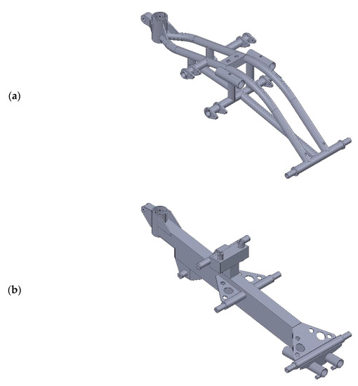 The third phase of the project dealt with the realization of the first prototype of the new trekking wheelchair. To execute manufacturing of the prototype, a small factory with know-how both in the construction of Aluminum bicycle frames and in devices for disabled people (handbike), was chosen. Then, it was necessary to revise the project to adapt the structural elements of the prototype with respect to the available production process. As an example, Figure 4 shows modifications made to the frame: in Figure 4a the 3D CAD model is based on welded aluminum tubular; in Figure 4b the frame has been simplified and it is composed of a single load-bearing extruded element made of a hollow rectangular section profile.