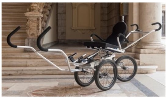 The presented project fits into this context of growing interest in AT, and aims to describe the design, manufacturing, and testing of a special wheelchair for people with impaired mobility to use in AT activities, developed by the University of Brescia and named the “Gölem project” [11]. This peculiar name refers to the local dialect version of “Mount Guglielmo” (Brescia, Italy), the highest mountain (1957 m) on the University premises, and a very loved trekking destination for locals. The Gölem project considers the AT initiatives in mountain areas and specifically the activity of accompanying people with every major type of mobility issue on mountain trails, using dedicated wheelchairs. This should be implemented while considering an environmentally friendly production and use of the device. The literature analysis, combined with the market analysis described in previous work [11] highlighted the presence of several available technical solutions, as briefly reported in the following. Solutions can be divided into three main categories: self-propelled wheelchairs designed for developing countries; self-propelled off-road/all-terrain wheelchairs; and a new category of devices classified as trekking wheelchairs—ISO code 30.09.39 (according to ISO 9999:2016) [12,13,14,15,16,17]. The latter is the most promising and interesting for the development of devices suitable for AT initiatives. This class of products consists of a specific type of human powered trekking wheelchair similar to a sedan chair equipped with a wheel, conducted by at least two carriers managing the impaired boarded guest over rough terrain. Currently, there are only a few commercially available solutions of these trekking wheelchairs. The most well known are: Joëlette© and TrailRider©, presented in Figure 1 [16,17].