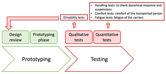 As shown in Figure 6, the prototype will need to undergo several types of tests. These tests have been divided into two groups. A first group of qualitative tests to assess the overall drivability and balance of the wheelchair and a second group of quantitative tests aimed at assessing the dynamical response of the wheelchair, the comfort of the passenger, and the physical effort of the carriers.