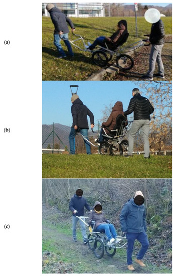 At this moment, the first group of qualitative field tests have been carried out to assess drivability, looking at the device from the carrier’s point of view, although with some delay due to the pandemic situation. These tests were carried out by a group of expert designers and some members of BrAL (Brixia Accessibility Lab) and were performed in a park and on some simple mountain bike trails nearby (Figure 7). There were always two carriers, from a pool of three people who worked on the wheelchair development, alternating in their role (both in the rear and front positions). In these tests, the passenger was a non-disabled person.