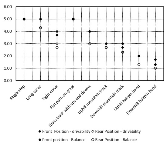 The rating scale uses a range from 1 to 5, where 1 is the least satisfactory score and 5 is the most satisfactory (1 = very poor; 2 = poor; 3 = fair; 4 = good; 5 = very good). The two considered aspects were: the drivability (Table 3) and the balance (Table 4), differentiating between the rear and front positions. Before starting the test session, the three carriers were instructed about the evaluation grid and the purpose of the test and of the survey.