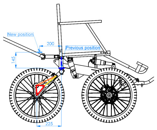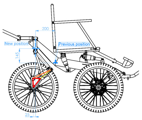 In particular, the first prototype of the wheelchair highlighted the difficulty for carriers to execute some maneuvers and to keep the wheelchair balanced, especially in tight turns, as well as on dirt roads with deep potholes (maneuver 7, 8, and 9). Therefore, the design of the prototype was modified to reduce this problem, and thus improve drivability by excluding the danger of overbalancing. As a result, two components of the device were modified: the frame was lengthened, and the rear suspension bracket was redesigned. Figure 9 shows the prototype configuration of the wheelchair before the qualitative tests, while Figure 10 shows the modification implemented in the design of the prototype on the frame and suspension. The blue steering axis (blue mark in Figure 9 and Figure 10) was moved 200 mm back, and 145 mm high, to comply with the new geometry (keeping the desired vertical wheel excursion). As a result, the rear wheel trail was decreased from 225 mm to 25 mm, equal to the ground position of the steering axis relative to the wheel contact patch center (steer axis is vertical). This was a trade-off, sacrificing part of the former extreme agility towards a more manageable vehicle.